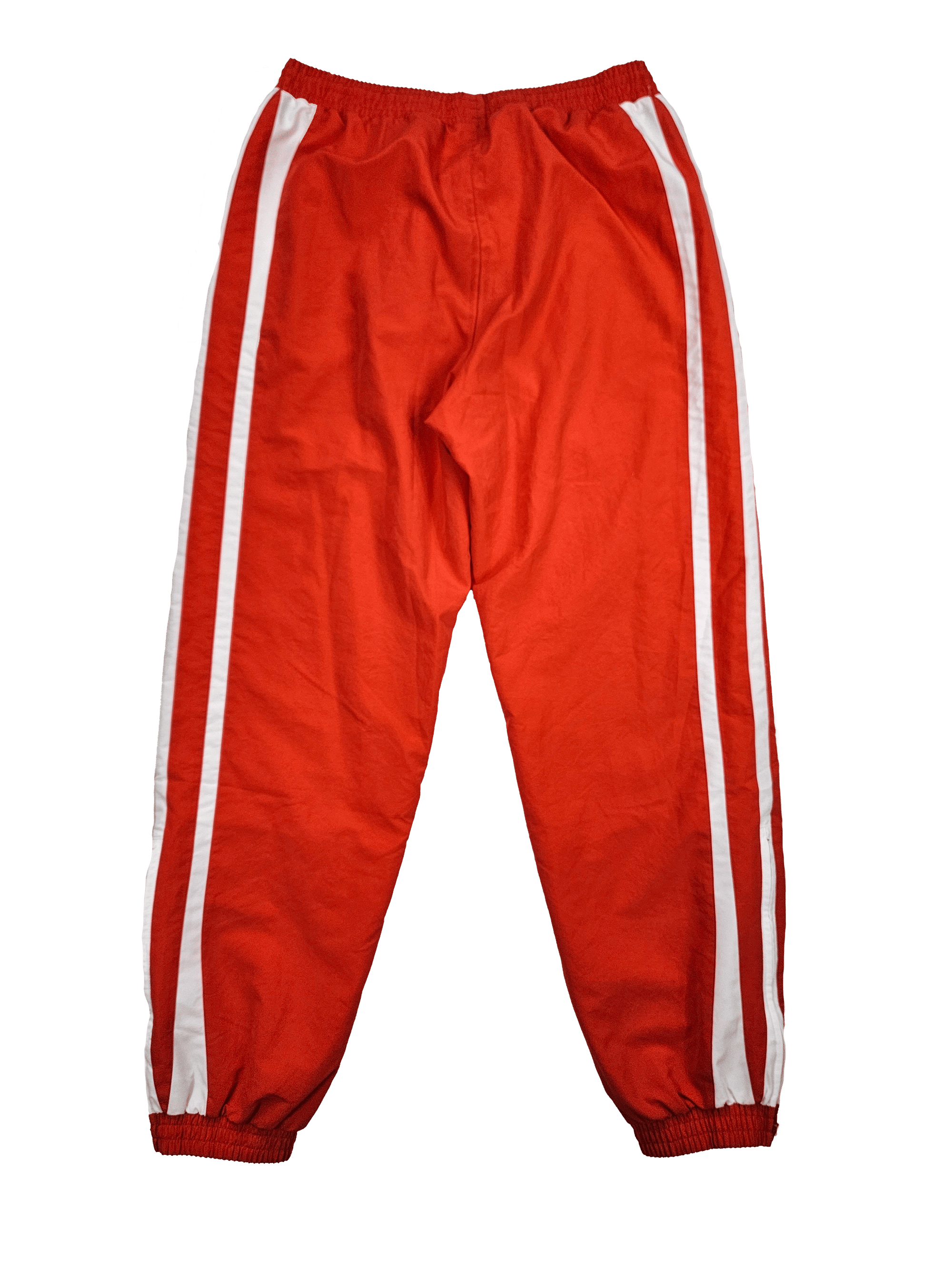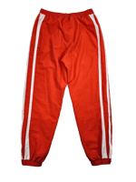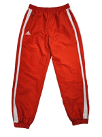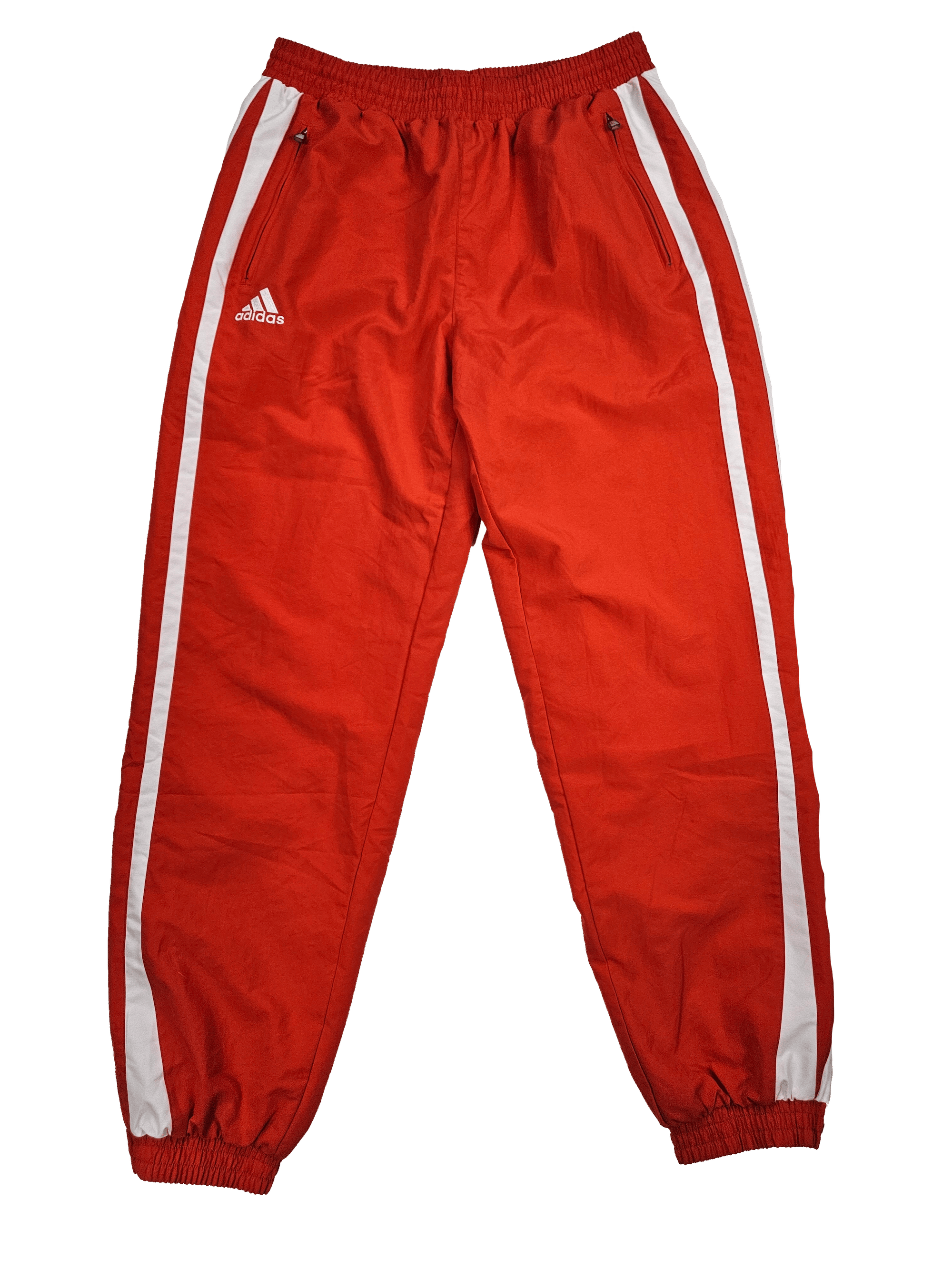 Classic red Adidas joggers with zipper pockets and side vents at bottom leg
