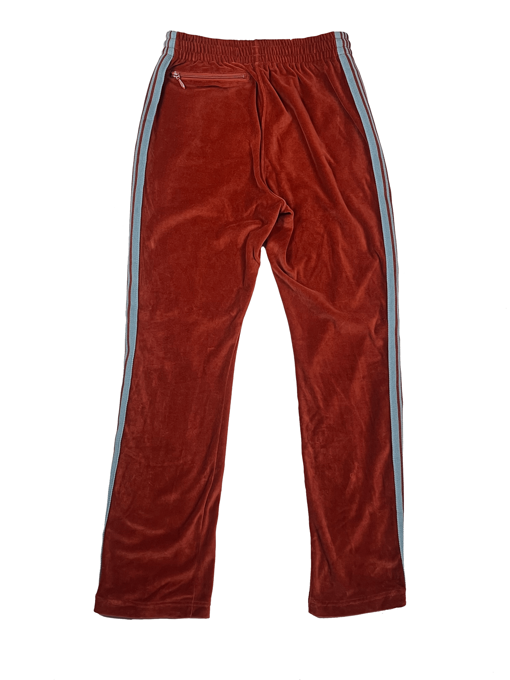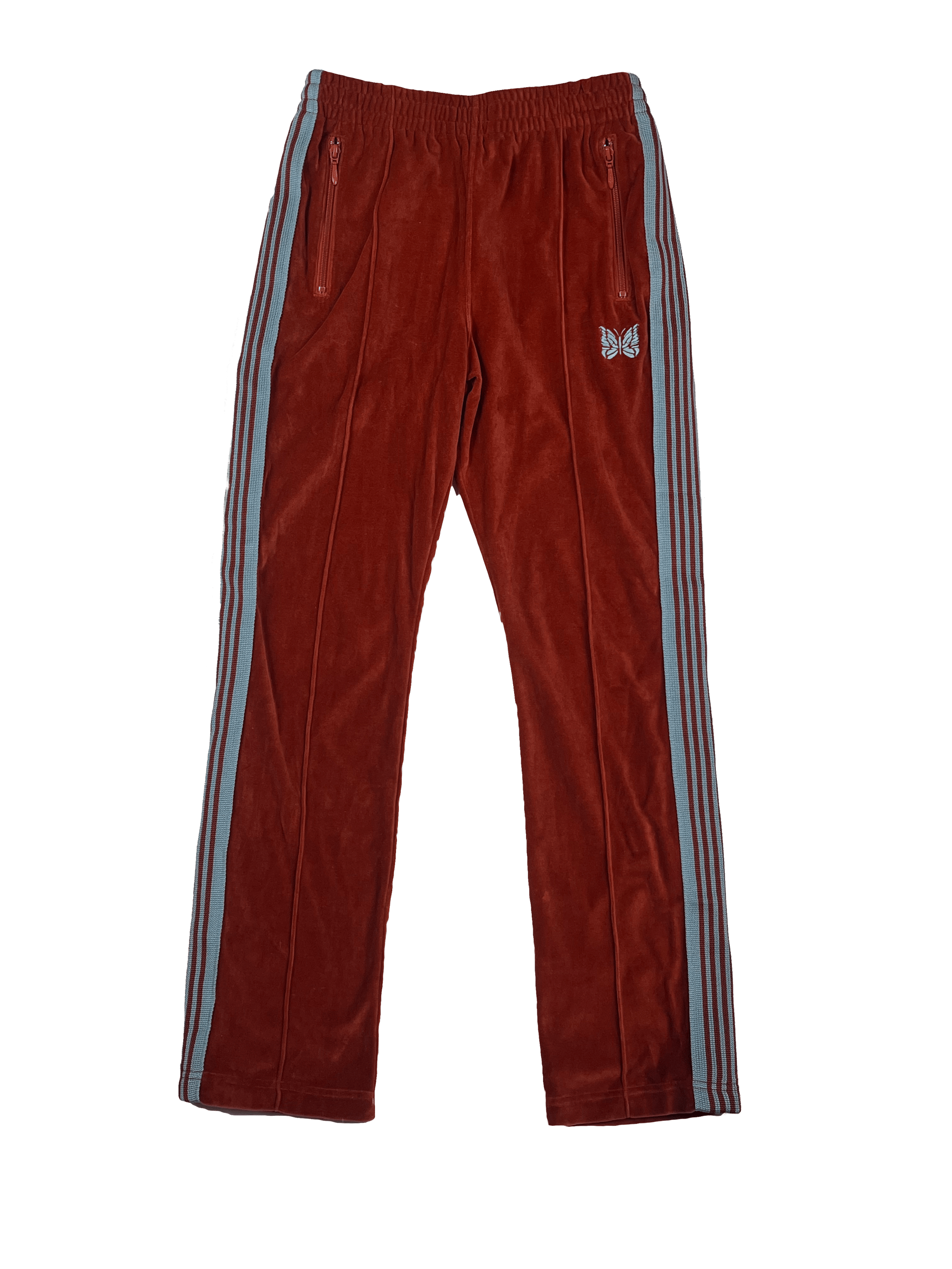 Slim fit burgundy track pants with blue stripes from Japanese designer brand Needles