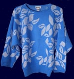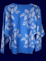 Vintage batwing knitted sweater featuring a very peaceful looking white leaf pattern againt sky blue