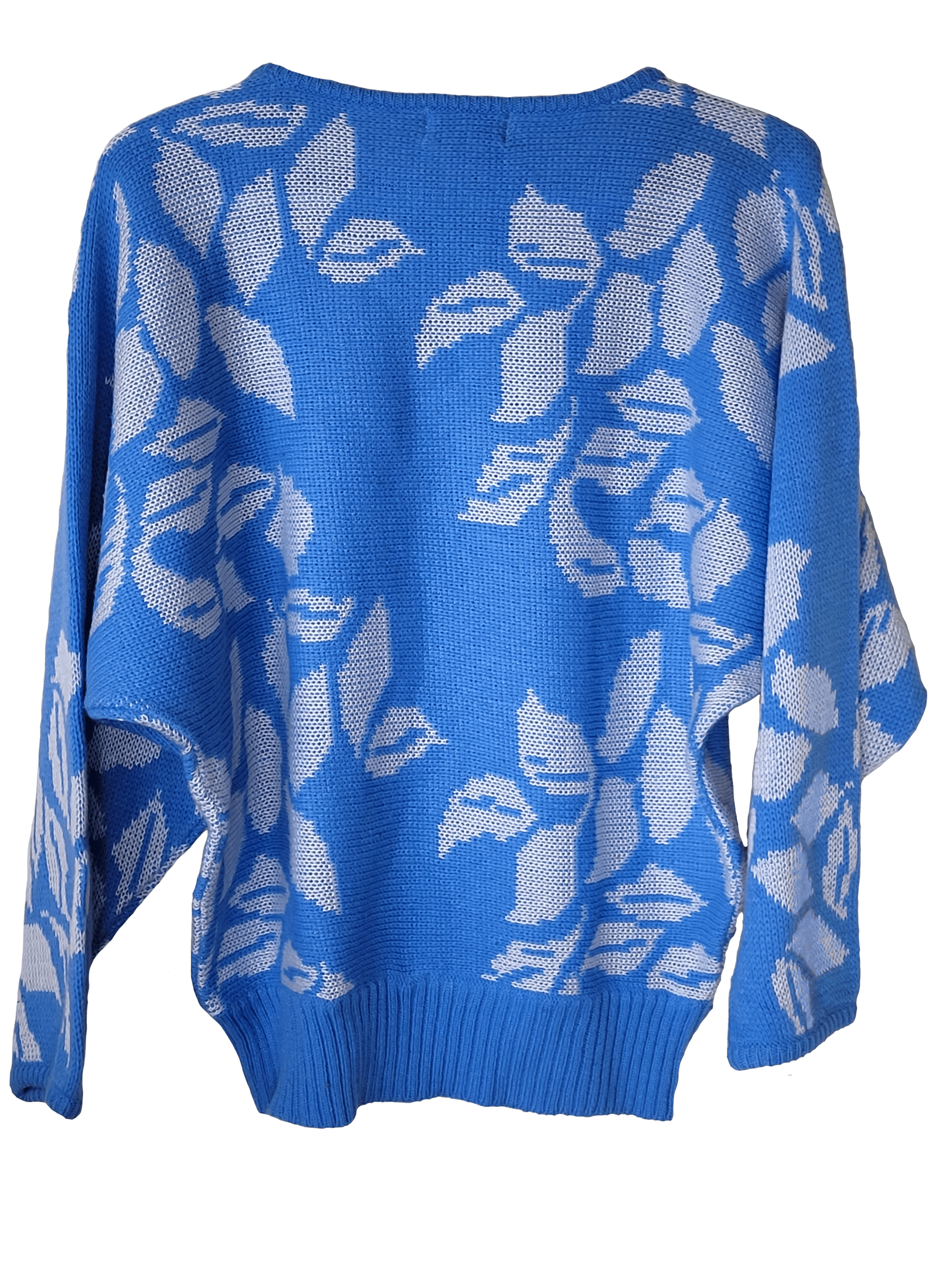 Vintage knitted sweater featuring a very peaceful looking white leaf pattern againt sky blue