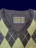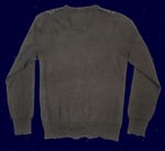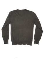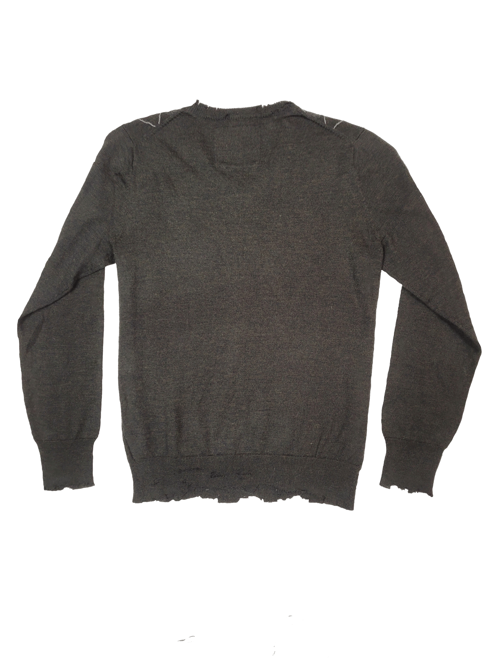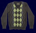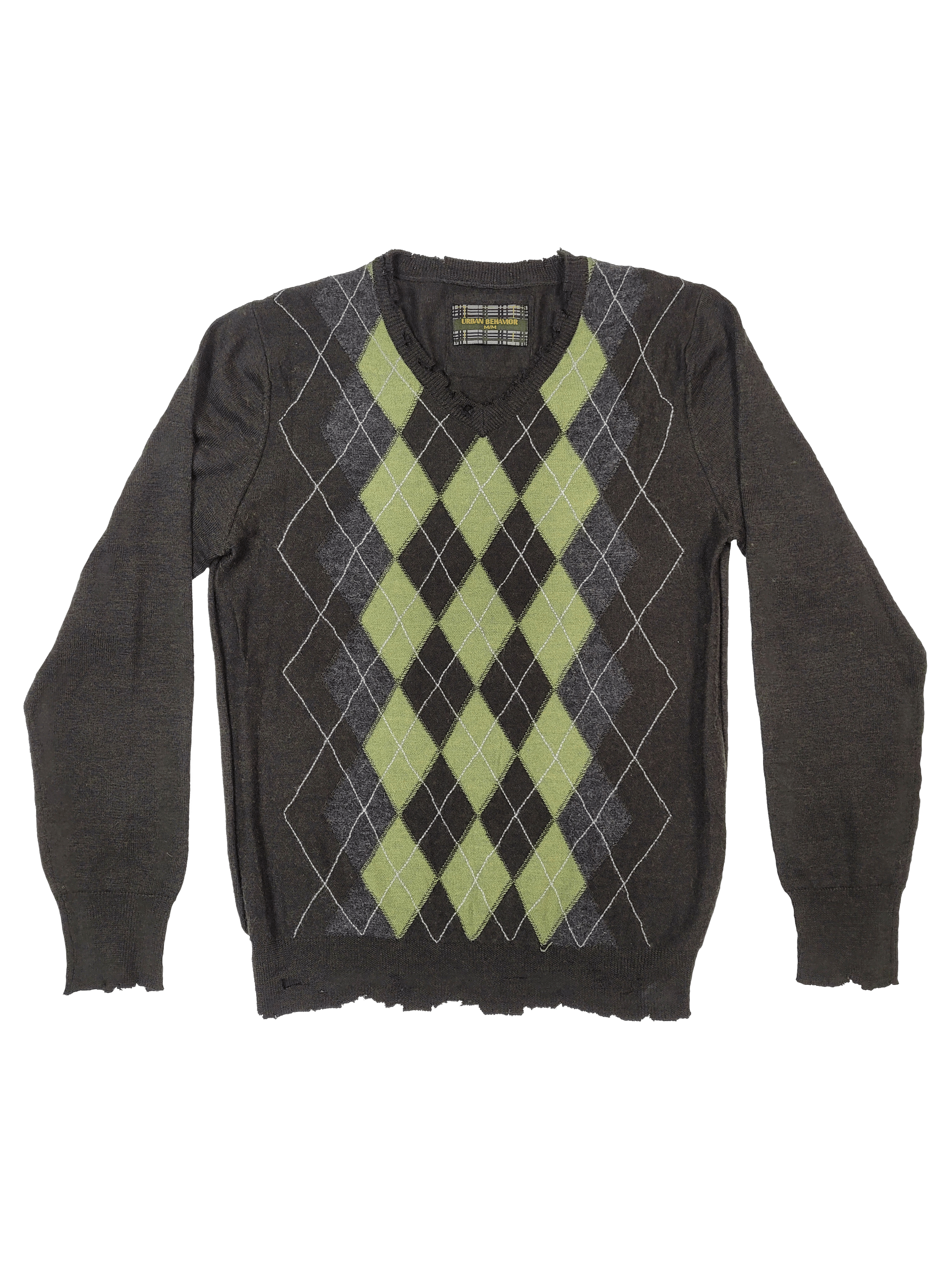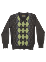 Distressed brown knit long sleeve with argyle pattern in pale green, grey and white stitching