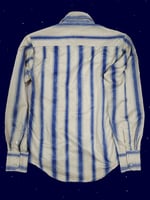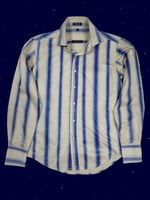 Beige button up shirt with screen printed royal blue "spray painted" looking stripes