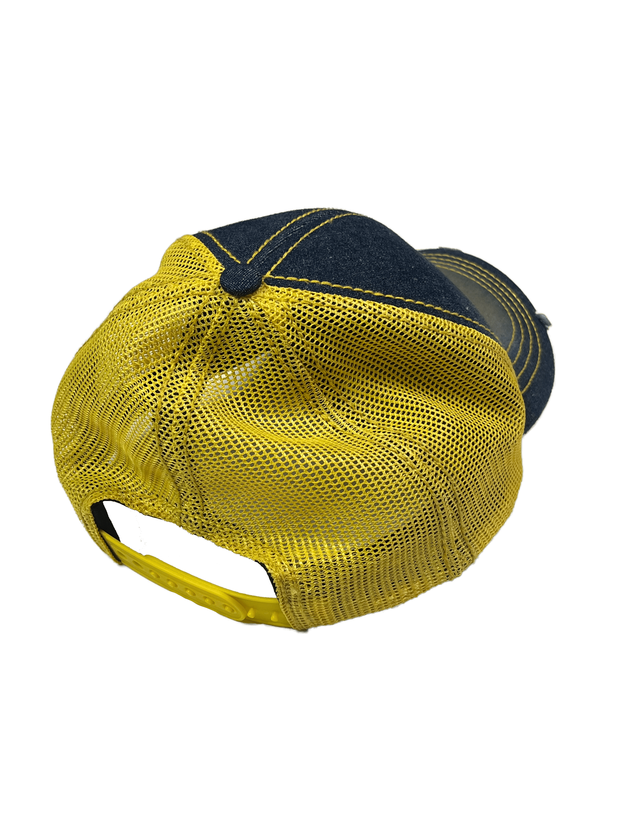 Distressed denim and yellow trucker's cap from Bodied by Kali Uchis