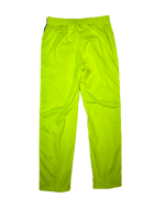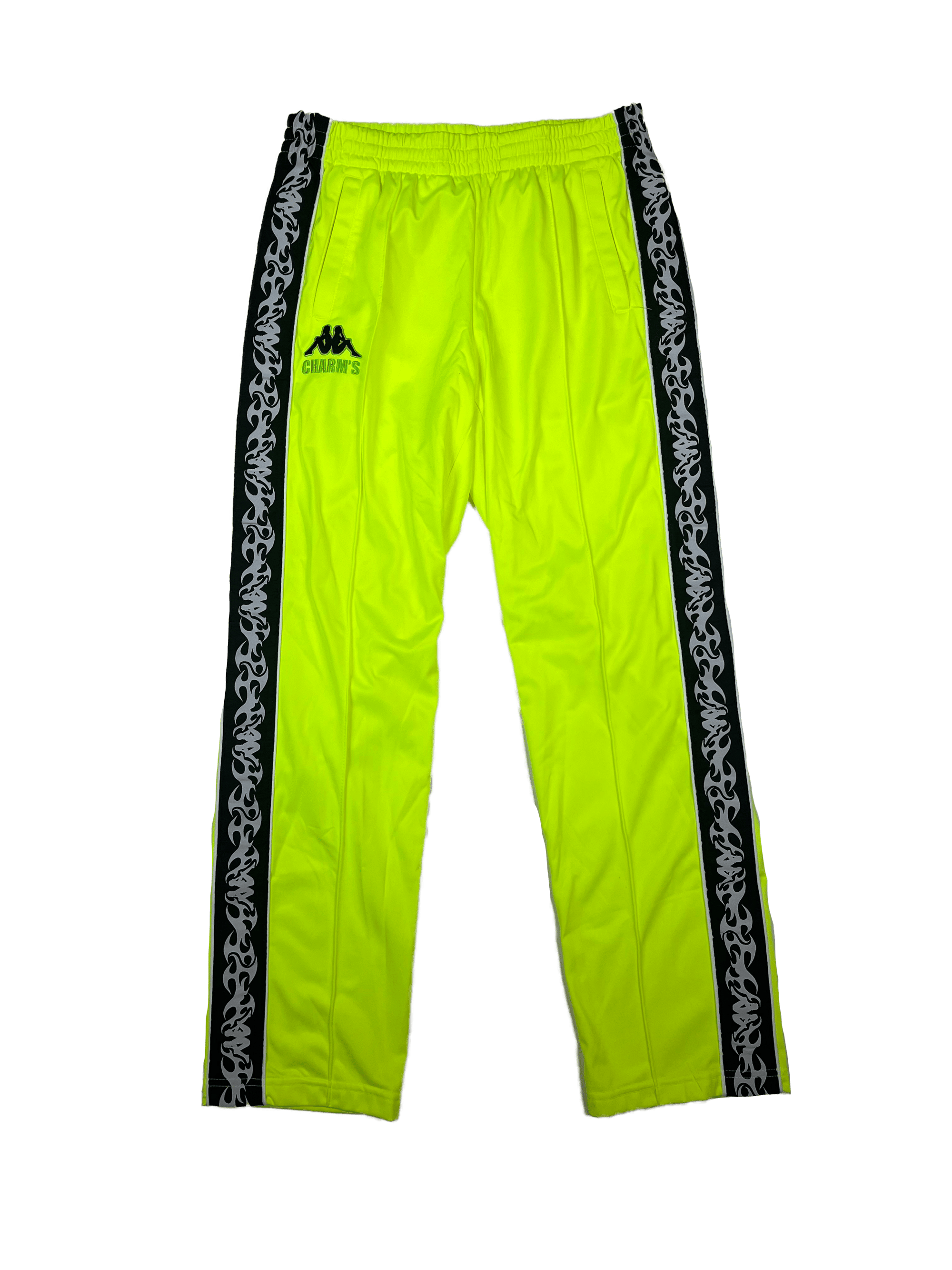 Neon yellow track pants with contrast black and white side stripes
