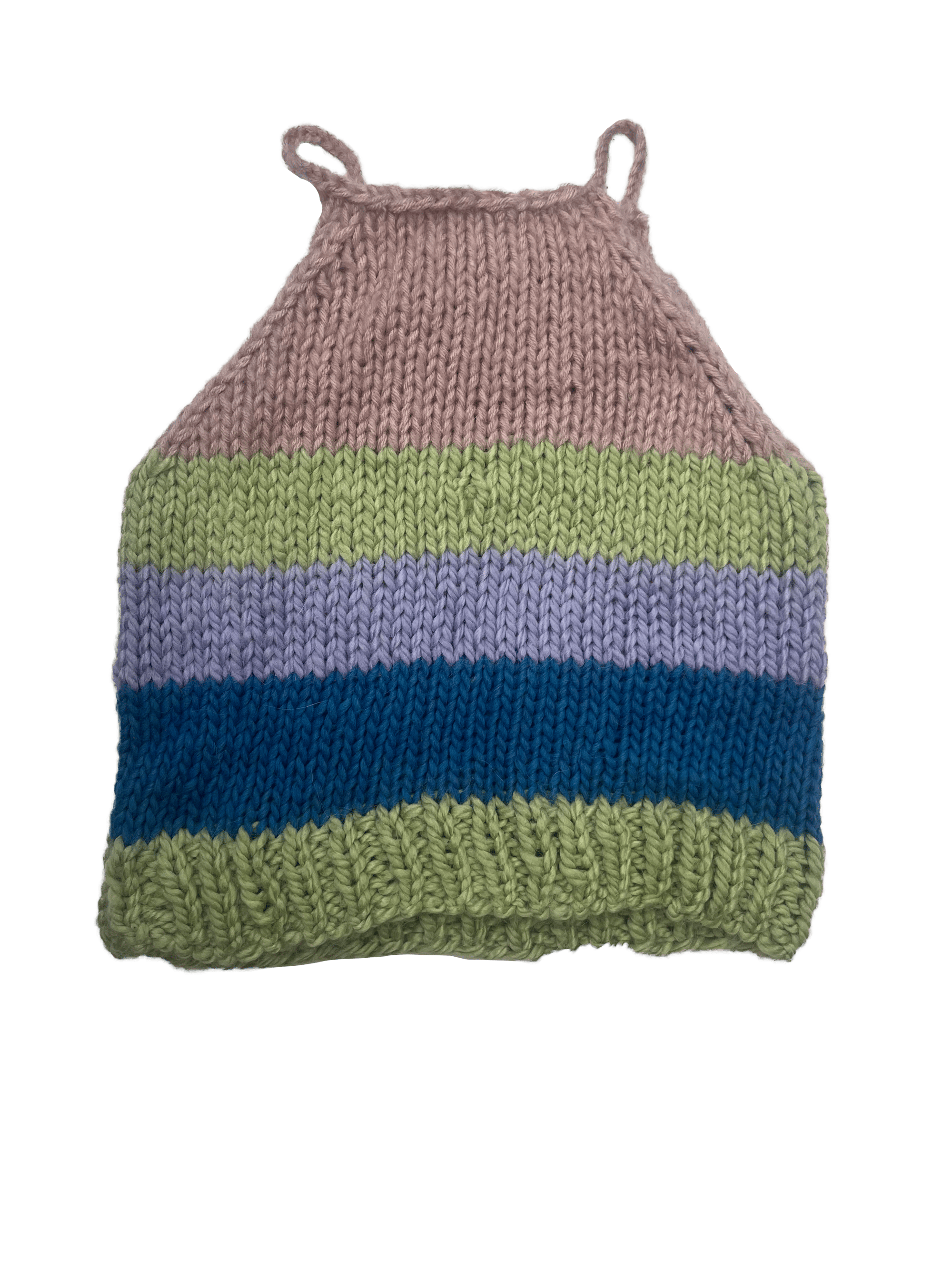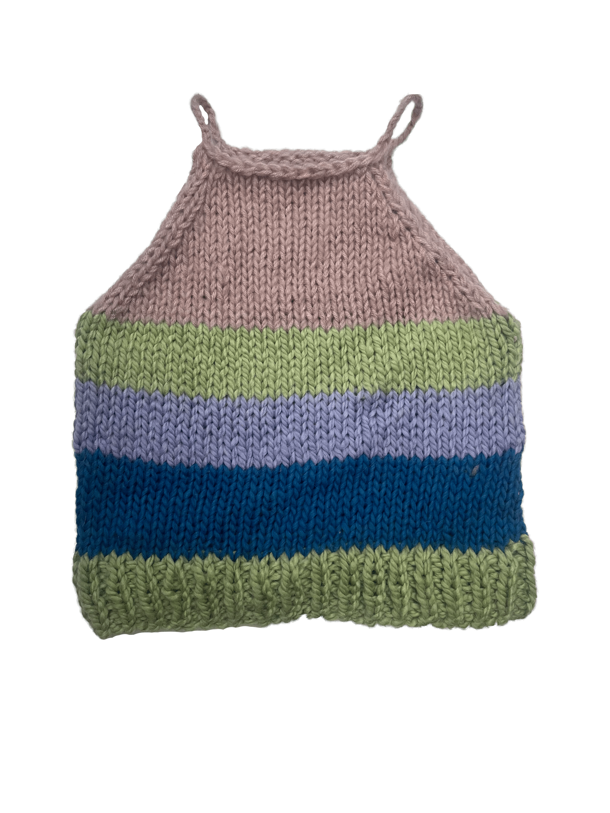 Soft and fuzzy crochet cami in Pale pink, green, lilac and navy stripe.