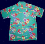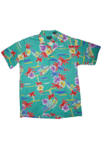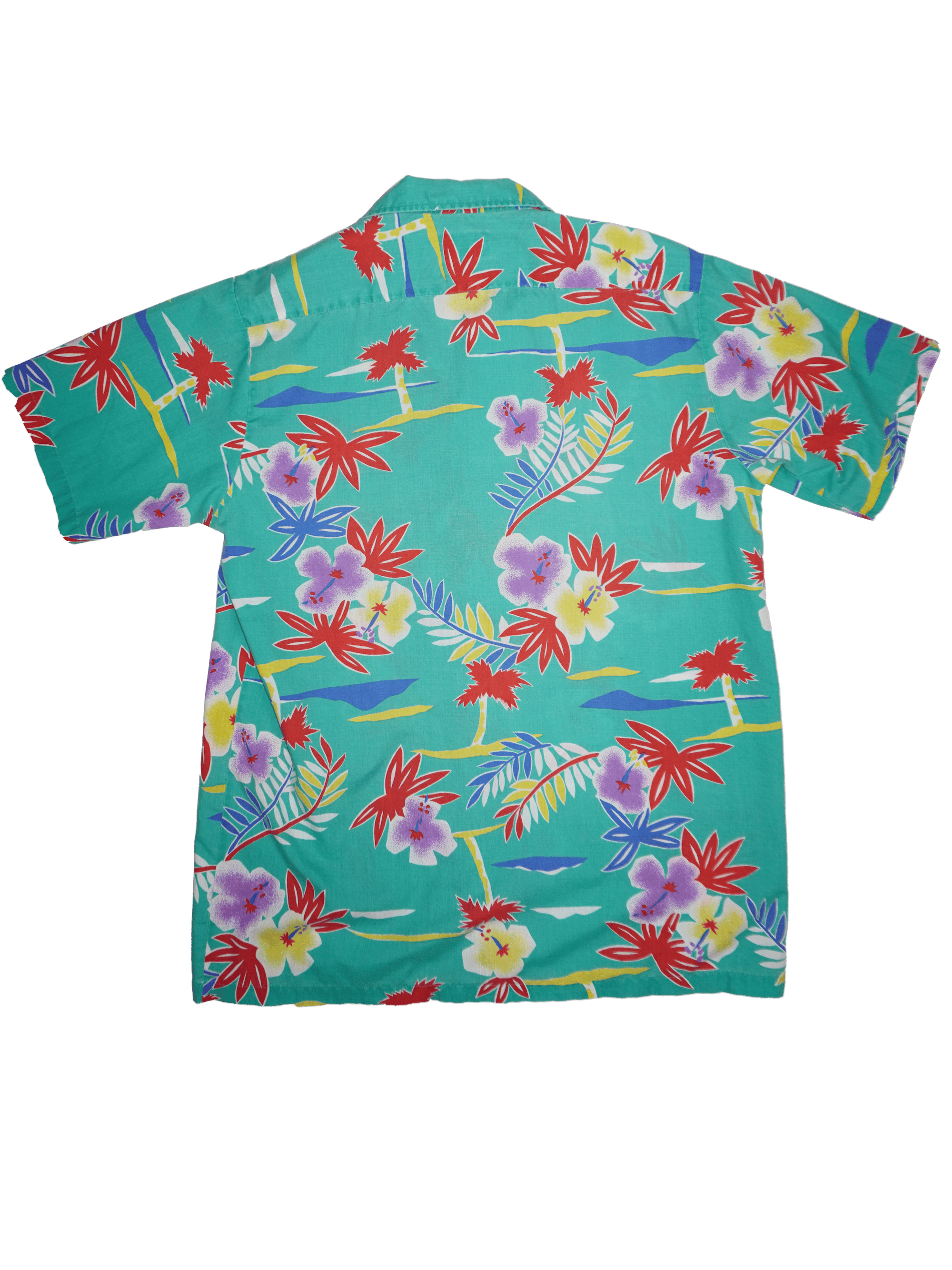 Aqua floral/ palm print button up in tones of red, purple, white, yellow and blue