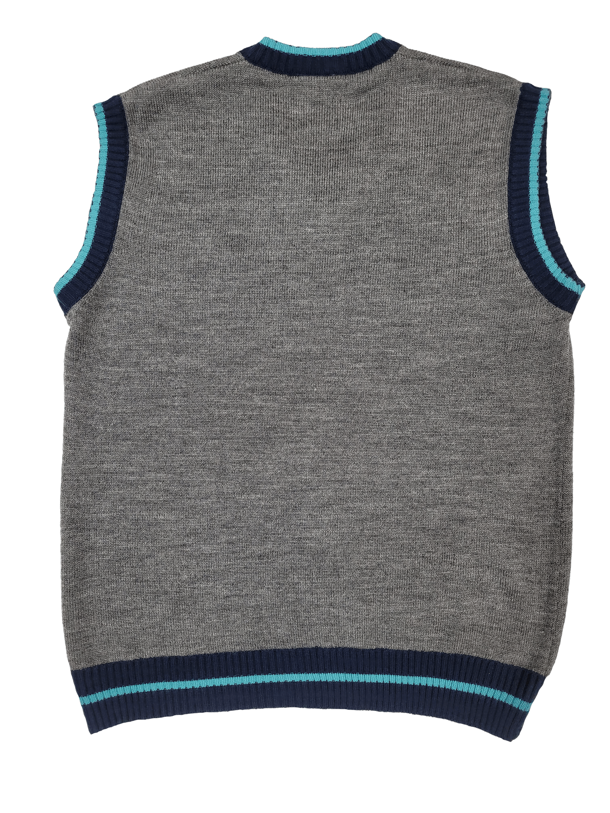 Ribbed aqua and navy contrast stripes at neckline, arms and hem